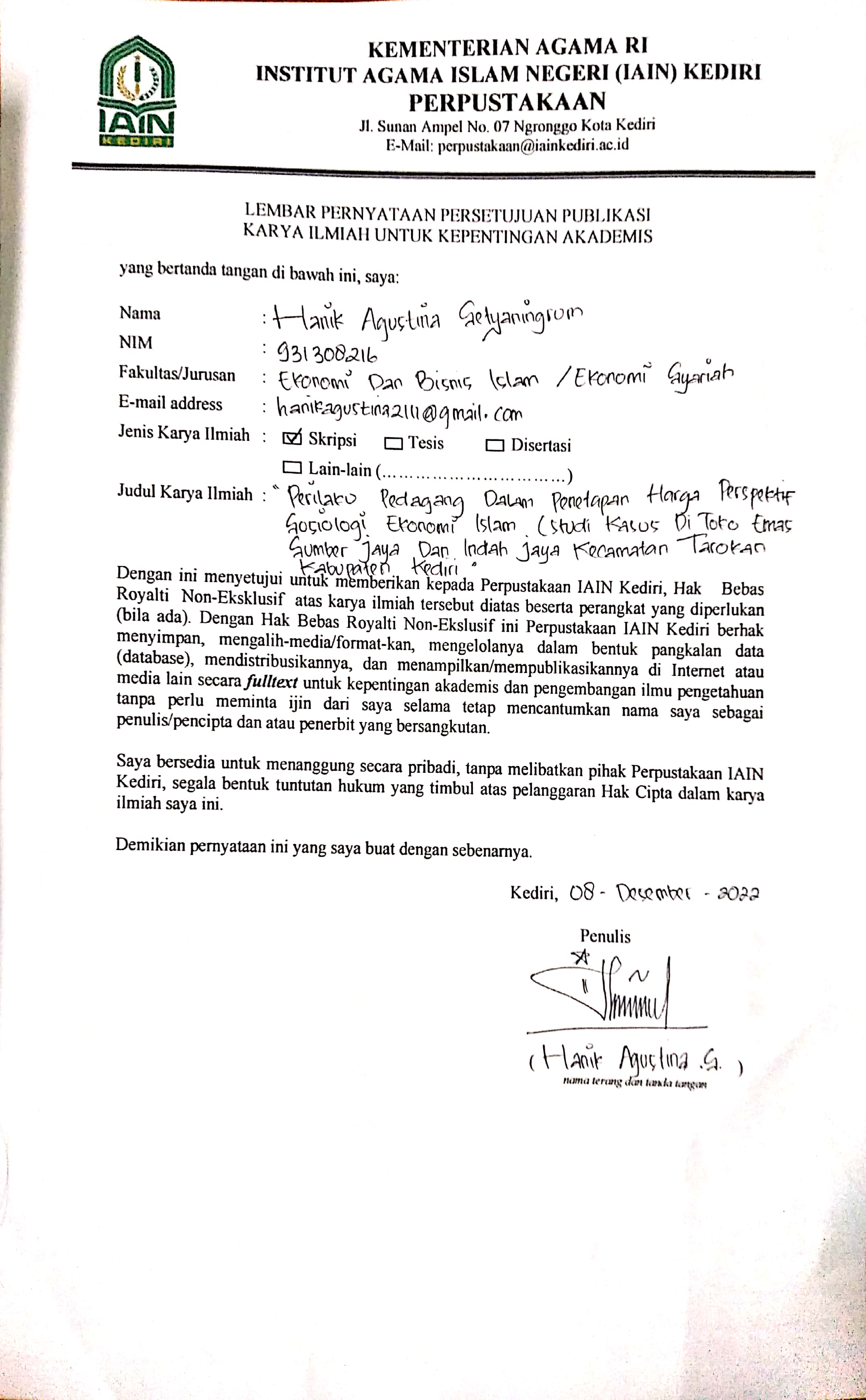 Setyaningrum, Hanik Agustina (2022) Perilaku Pedagang Dalam Penetapan Harga Perspektif Sosiologi Ekonomi Islam (Studi Kasus Di Toko Emas Sumber Jaya Dan Indah Jaya Kecamatan Tarokan Kabupaten Kediri). Undergraduate (S1) thesis, IAIN KEDIRI.